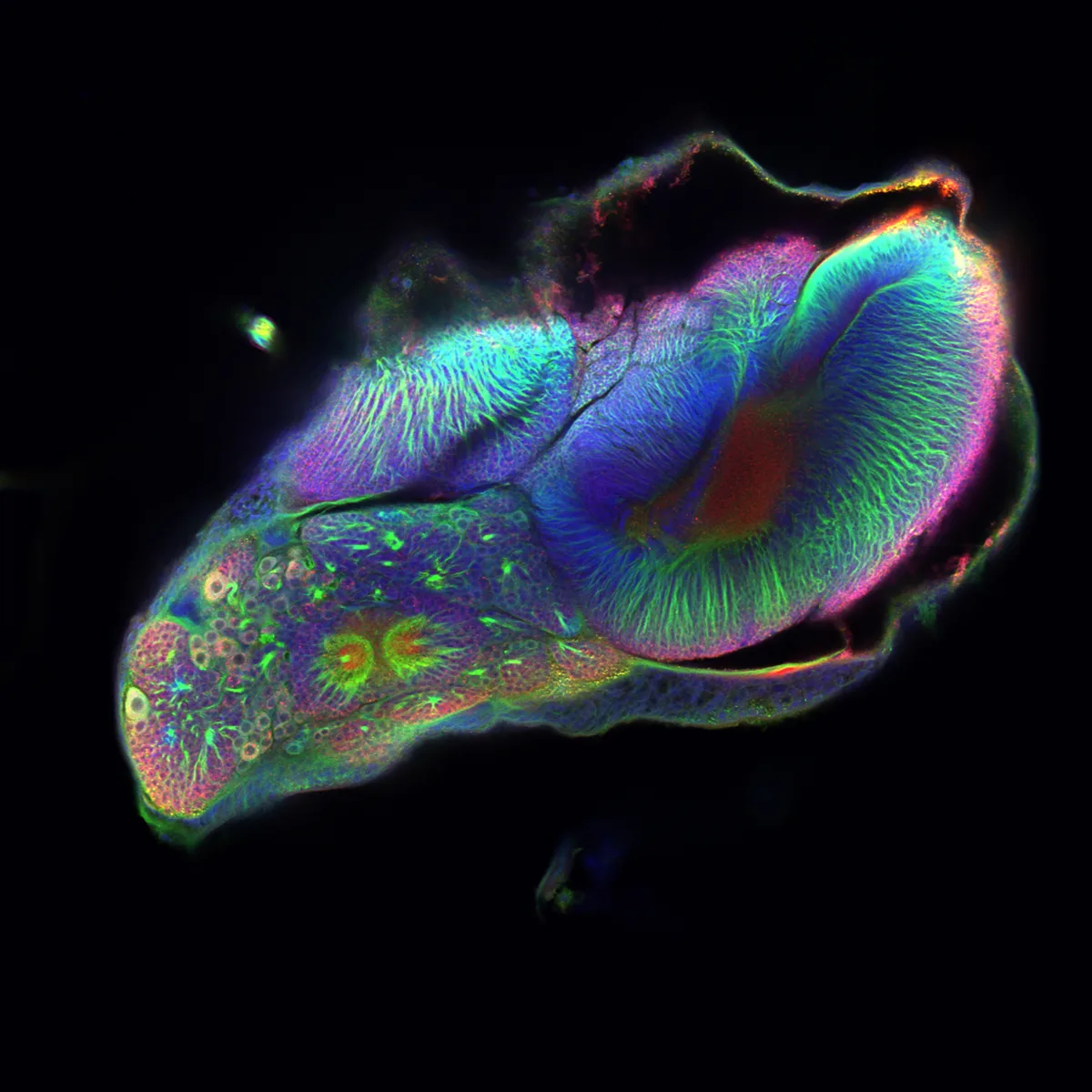 This image is of the brain of a butterfly undergoing metamorphosis, where new neurons are born through a process called neurogenesis. Neurogenesis occurs in many species during development and adulthood, and studying it can provide valuable insights into how the nervous system is formed. - Photo Credit: Amaia Alcalde Anton/Wellcome Photography Prize 2025